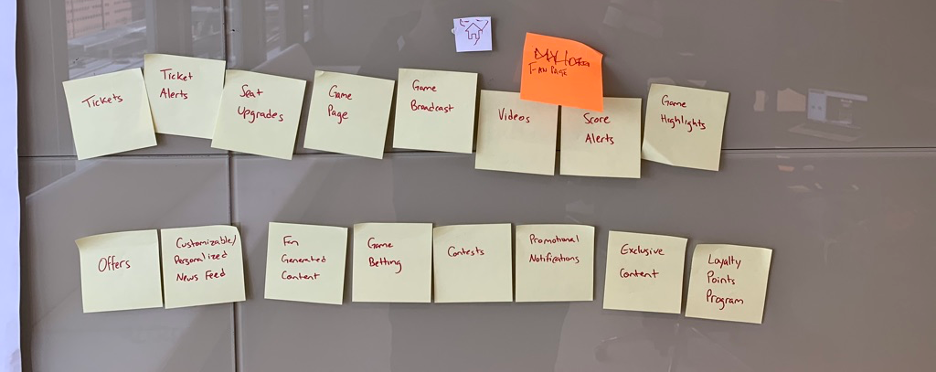 Fans were given cards with a list of current/future features in the app and asked to sort them into groups. Once the groupings were completed, they were asked to name each group and assign an appropriate icon from a list provided to them.