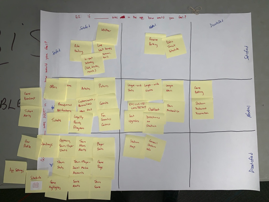 Fans are asked to place each feature on a Kano table. The Kano table asks the user “If *feature* was in the app, how would you feel?” and “If *feature* was NOT in the app, how would you feel? This evaluation helps us determine how important a particular feature is.
