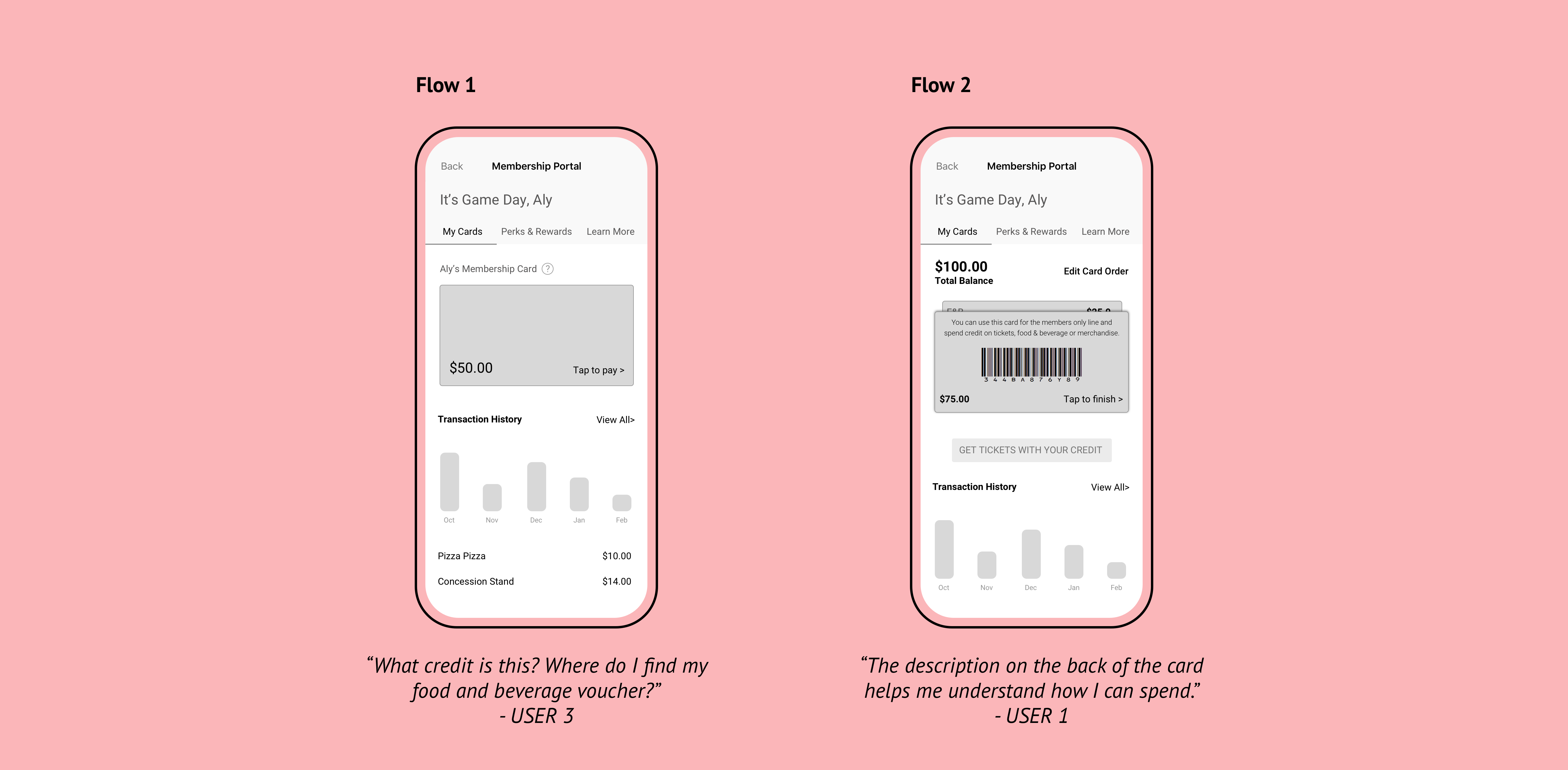 1 - Users wanted to know what credit they were spending. Having one card with combined credits created confusion around if they were spending their account credits or their food & beverage voucher. Assuming that one card would make it easier on users was incorrect.