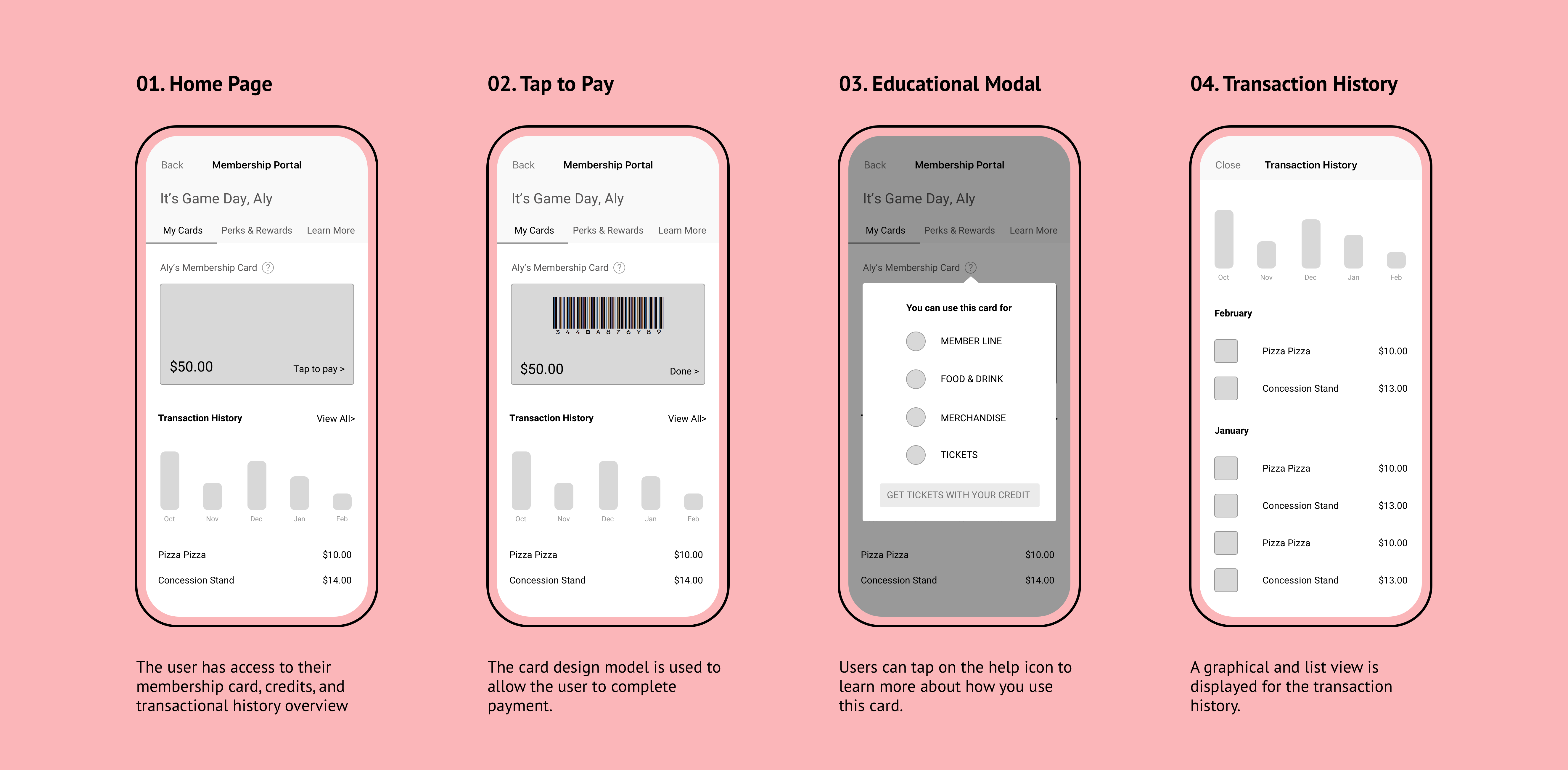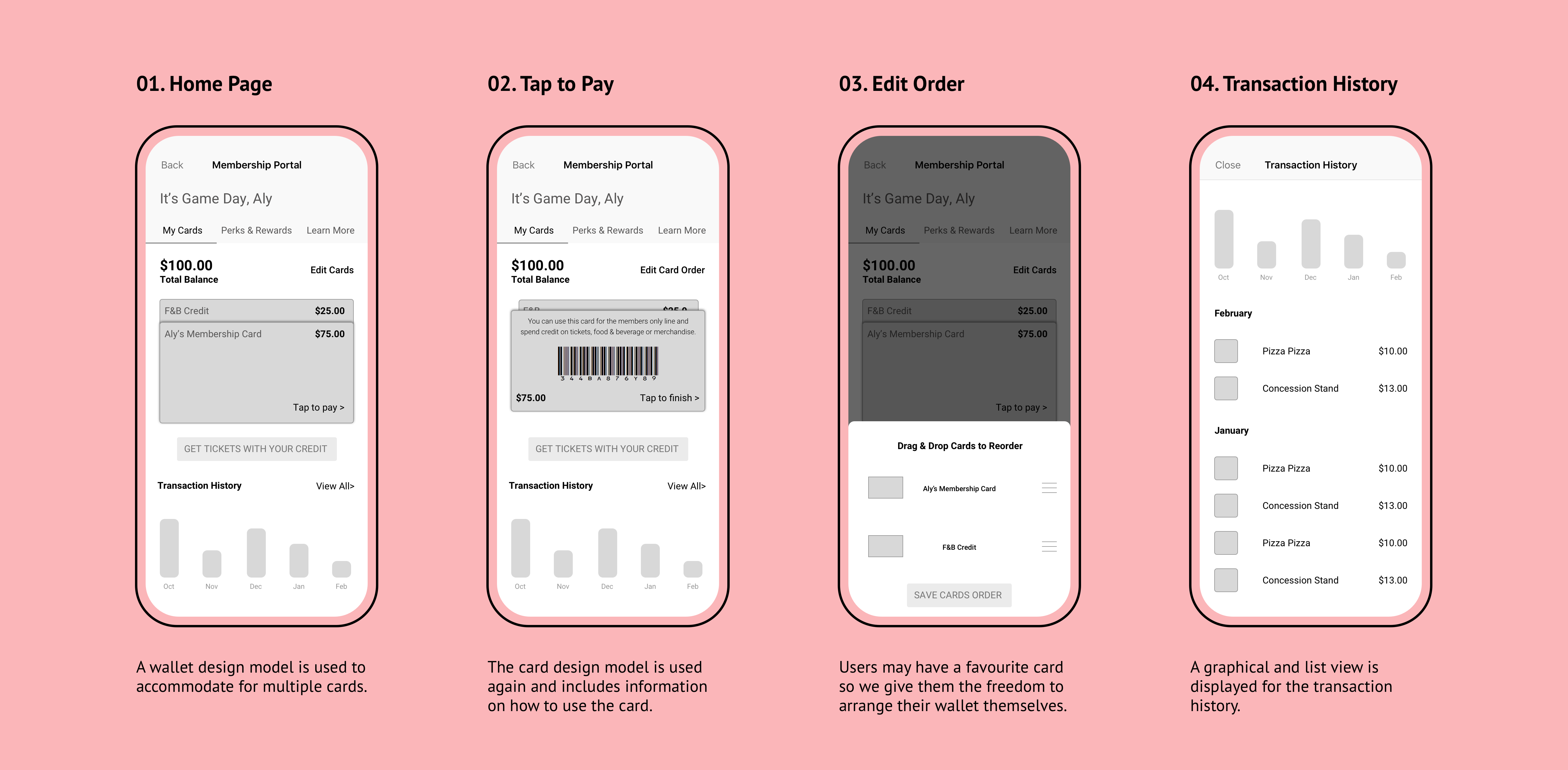 The wallet model is similar to the previous flow but breaks up the members' credit into separate cards. The educational component is incorporated into the card model by providing "how to use" details on the back of the card.