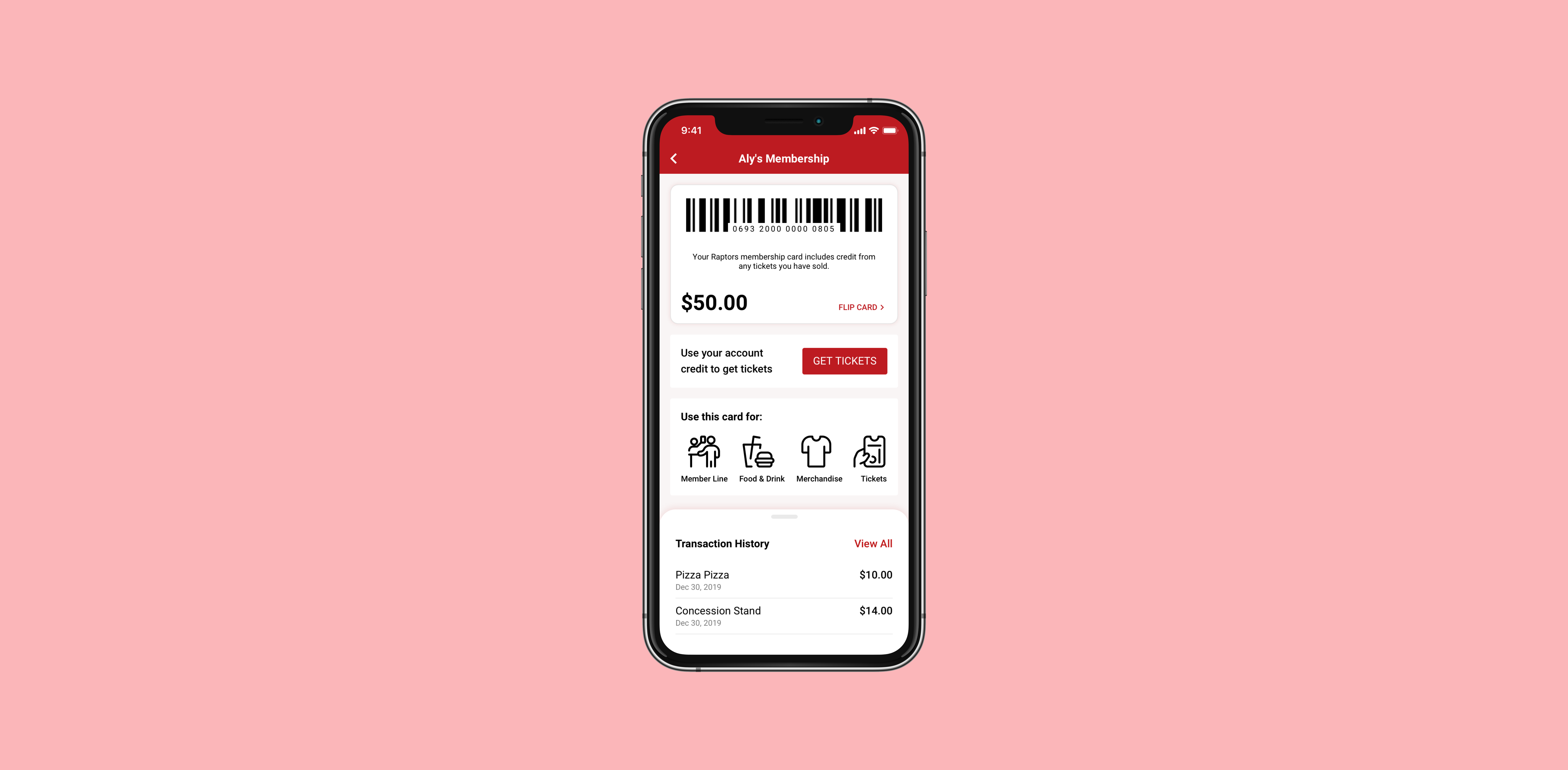 The card details page provides more information to members about their card and what they can do with it. A list view of transactional history is also shown here to provide them with a view of their previous purchases for this card. The graphical view was removed as users found that this visualization made them feel overwhelmed by their spending history. Members can scan their card for payment as well as purchase additional tickets from this page.